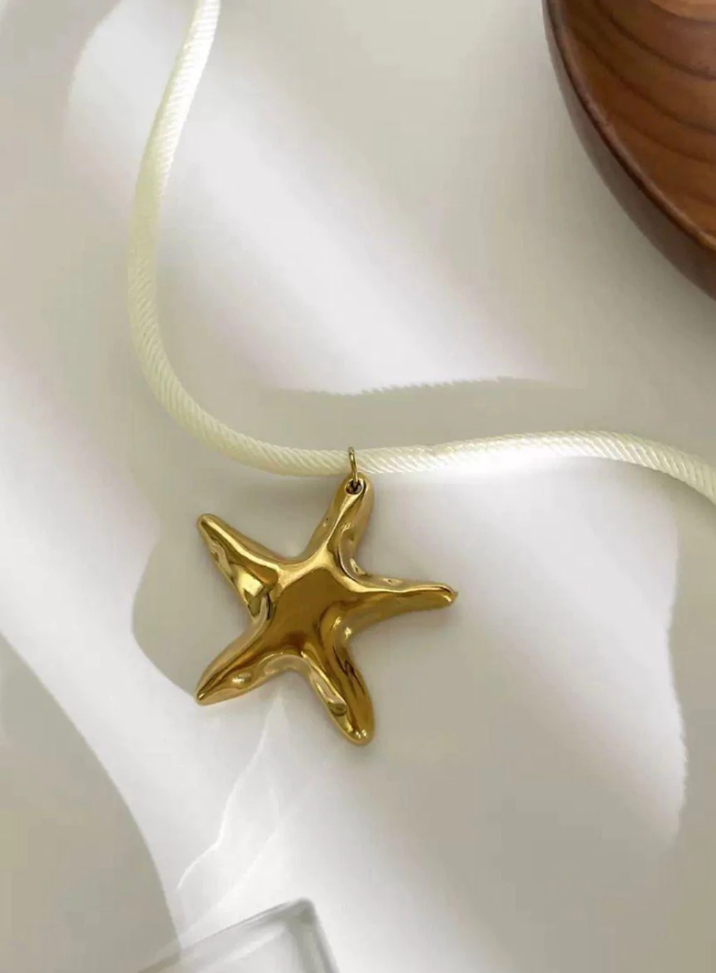 Collar con dije de estrella de mar dorada sobre una cuerda color marfil que le da un toque fresco y veraniego.